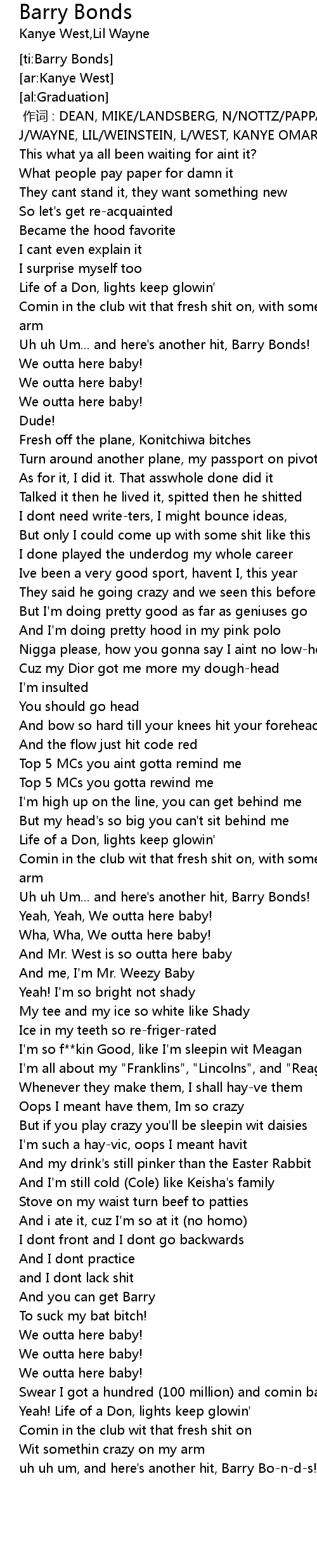 | [00:00.00] | 作词 : DEAN, MIKE/LANDSBERG, N/NOTTZ/PAPPARLARDI, F/VENTURA, J/WAYNE, LIL/WEINSTEIN, L/WEST, KANYE OMARI |