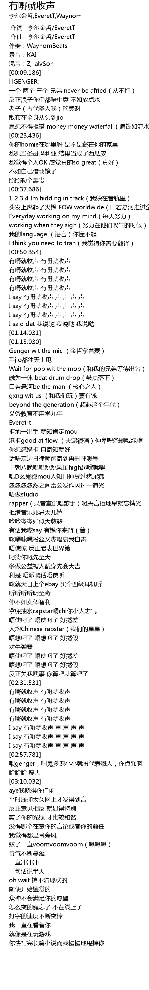 | [01:51.281] | wú zuò studio rapper lù yīn shì shuō chàng gē shǒu kǎi shì yán jù dì zǎo jiù wàng jīng guāng |
