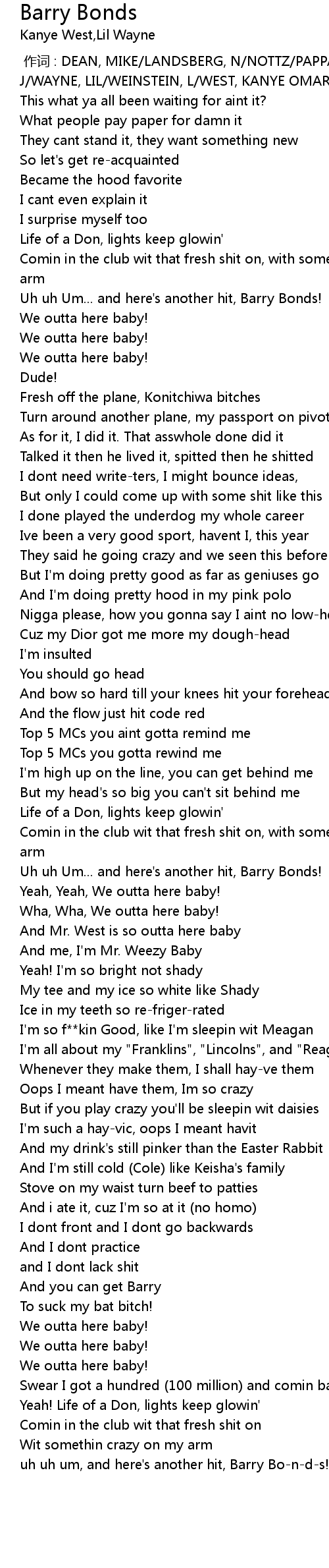 | [00:00.00] | 作词 : DEAN, MIKE/LANDSBERG, N/NOTTZ/PAPPARLARDI, F/VENTURA, J/WAYNE, LIL/WEINSTEIN, L/WEST, KANYE OMARI |