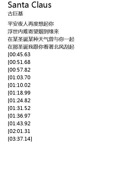| [02:53.60][01:31.52] | SANTACLAUS kě fǒu qǐng nǐ liú gěi wǒ xī jì |