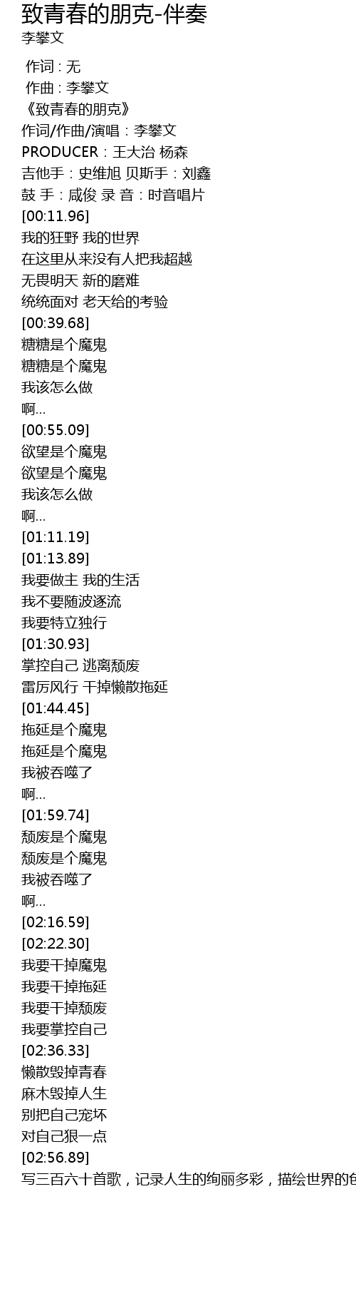 | [02:57.75] | 写三百六十首歌,记录人生的绚丽多彩,描绘世界的色彩斑斓。李攀文 |