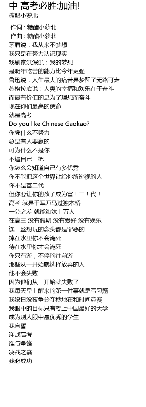 | [00:50.20] | gāo kǎo jiù shì qiān jūn wàn mǎ guò dú mù qiáo |