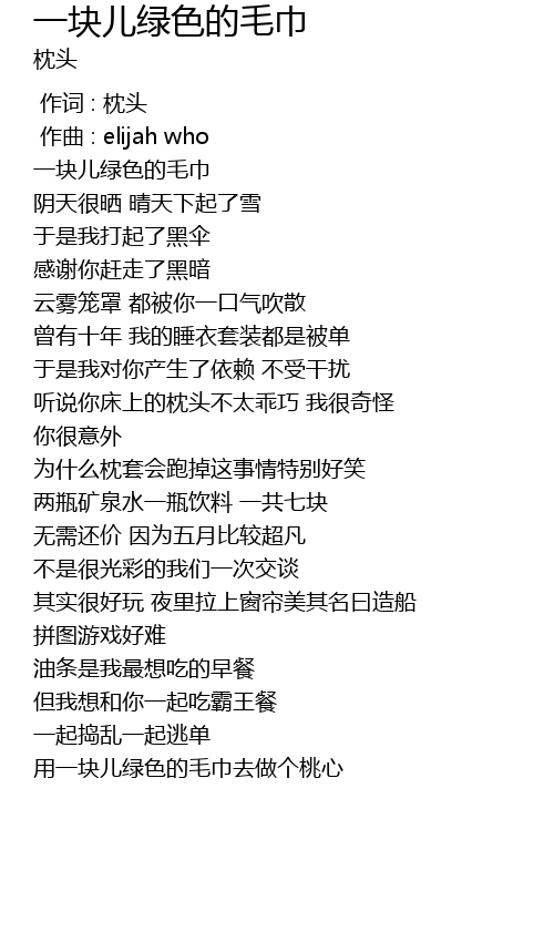 | [00:00.000] | 一块儿绿色的毛巾 |