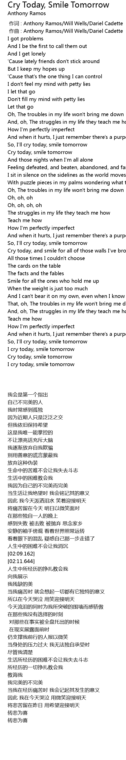 | [02:43.435] | Cry today, and smile for all of those walls I' ve broken through |