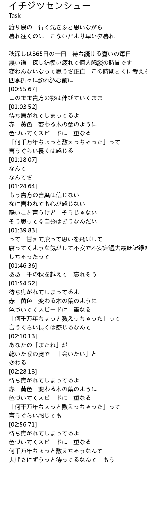 | [00:42.63] | 秋深しは365日の一日 待ち続ける憂いの毎日 |