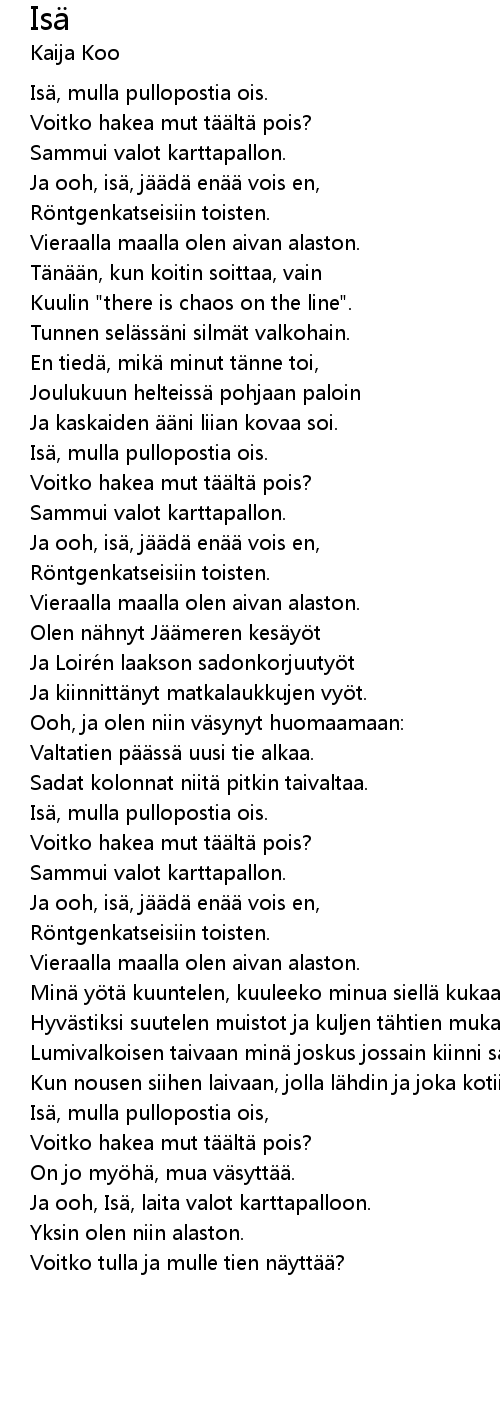 | Min y t kuuntelen, kuuleeko minua siell kukaan? | |
