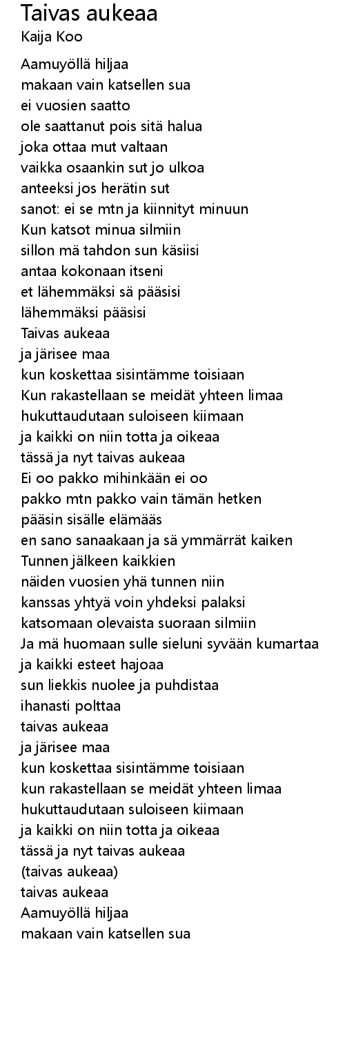 | Ja mä huomaan sulle sieluni syvään kumartaa | |