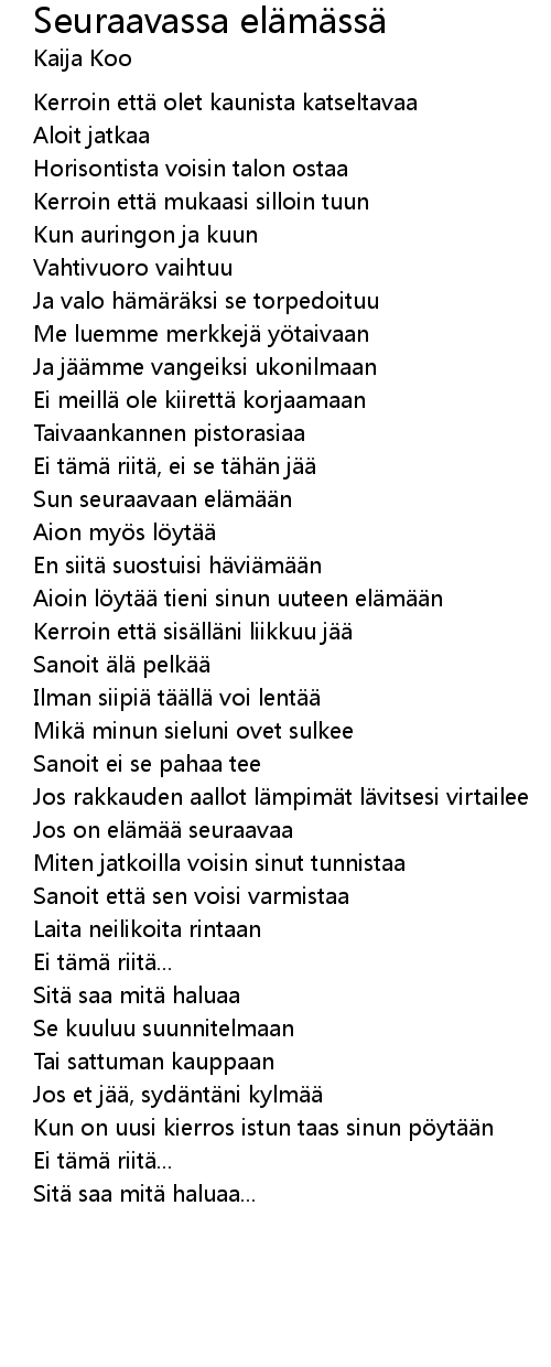 | Kun on uusi kierros istun taas sinun p yt n | |