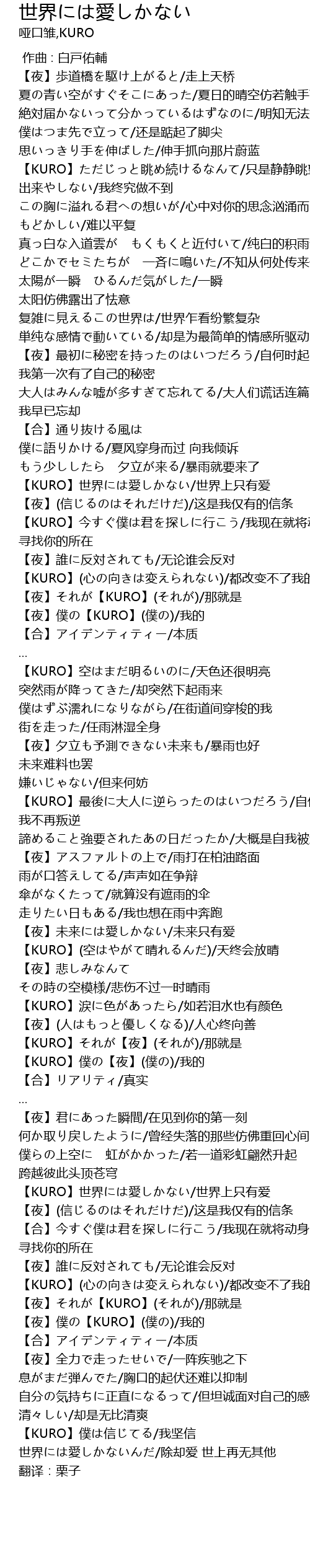 | [04:03.30] | KURO shì jiè ài shì jiè shang zhǐ yǒu ài |
