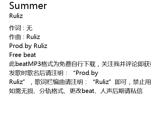 | 发歌时歌名后请注明:“Prod.by Ruliz”,歌词栏编曲请注明:“Ruliz”即可,禁止用于商业性质,尊重知识产权,侵权必究,谢谢。 | |