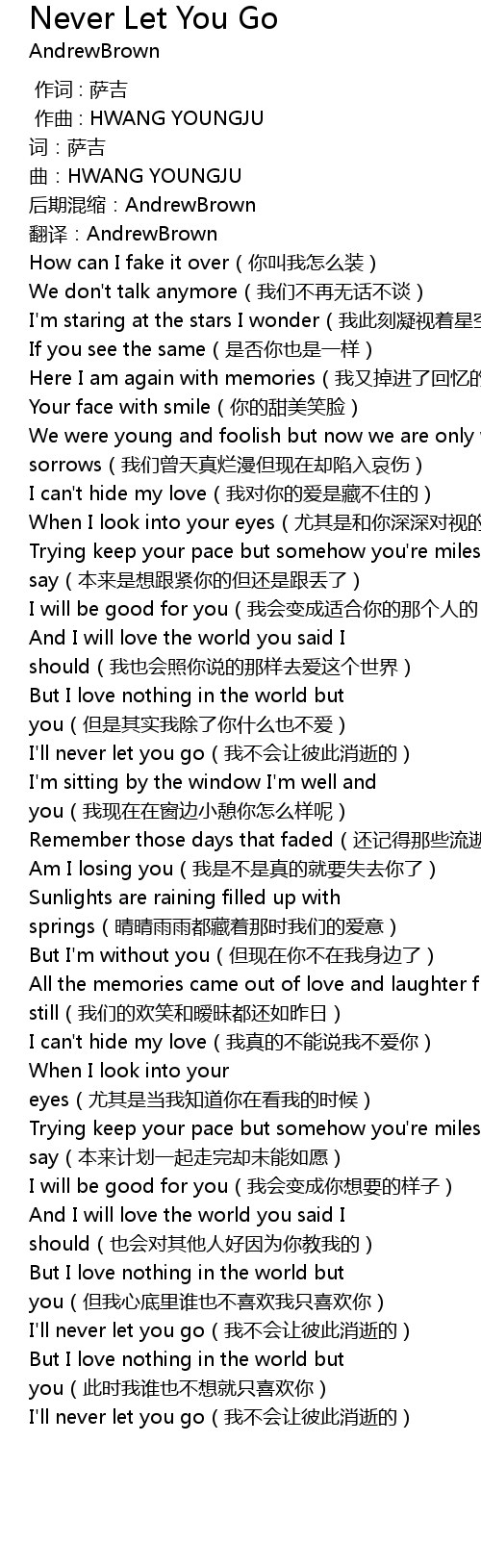 | [01:36.63] | I' ll never let you go wo bu hui rang bi ci xiao shi de |
