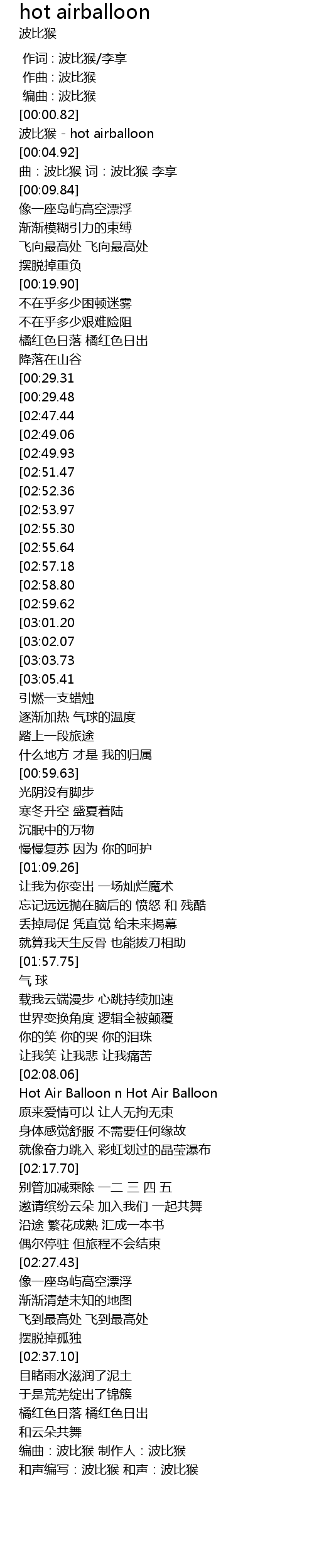 | [00:02.00] | 波比猴 - hot airballoon |
