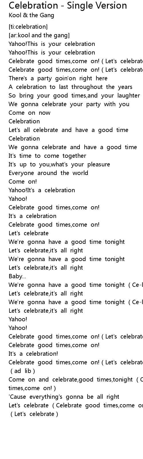 | [03:14.731] | Come on and celebrate,good times,tonight (Celebrate good times,come on!) |