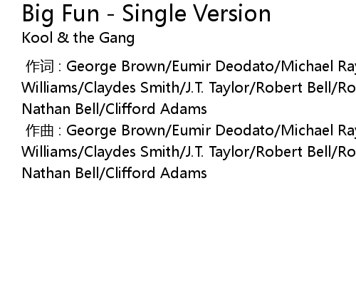| [00:00.000] | zuo ci : George Brown Eumir Deodato Michael Ray Curtis Fitzgerald Williams Claydes Smith J. T. Taylor Robert Bell Robert Spike Mickens Ronald Nathan Bell Clifford Adams |