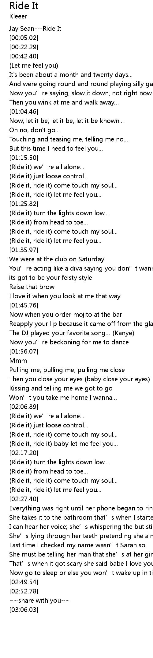 | [02:25.08] | Ride it, ride it let me feel you... |