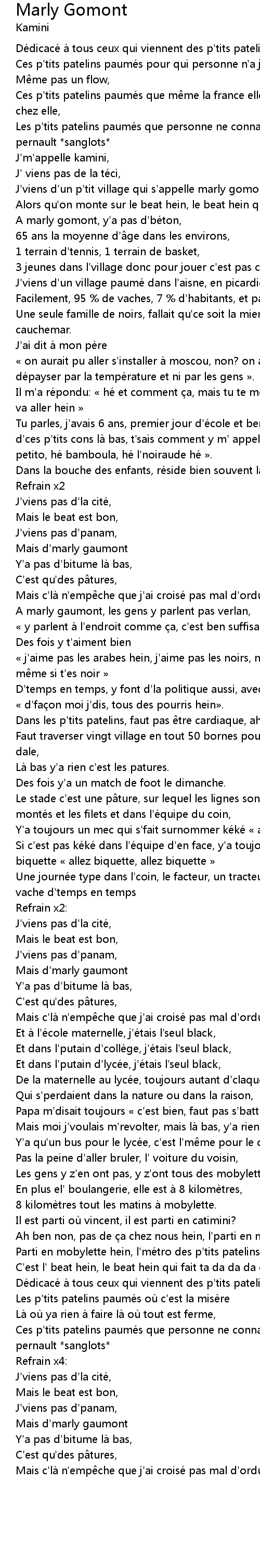 | J' viens d' un p' tit village qui s' appelle marly gomont, | |