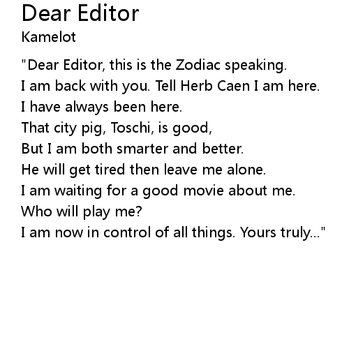 | [00:41.75] | "Dear Editor, this is the Zodiac speaking. |