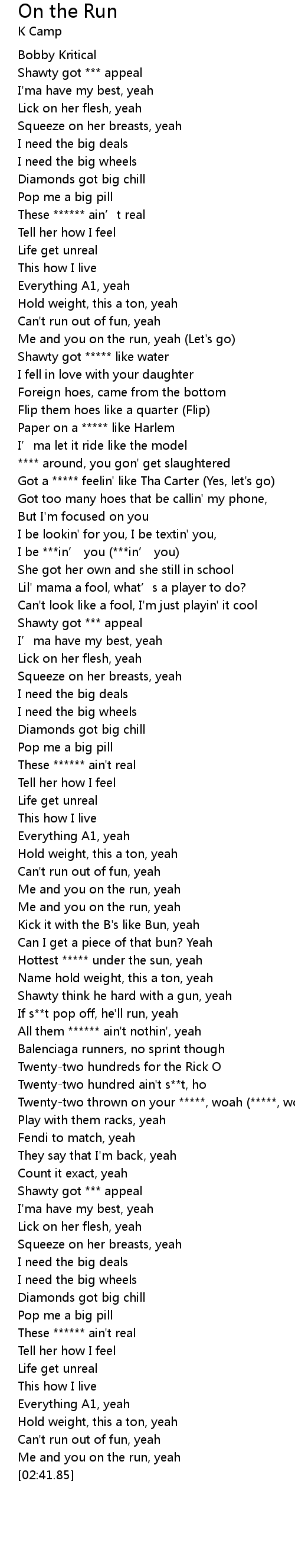 | [00:41.65] | Me and you on the run, yeah Let' s go |