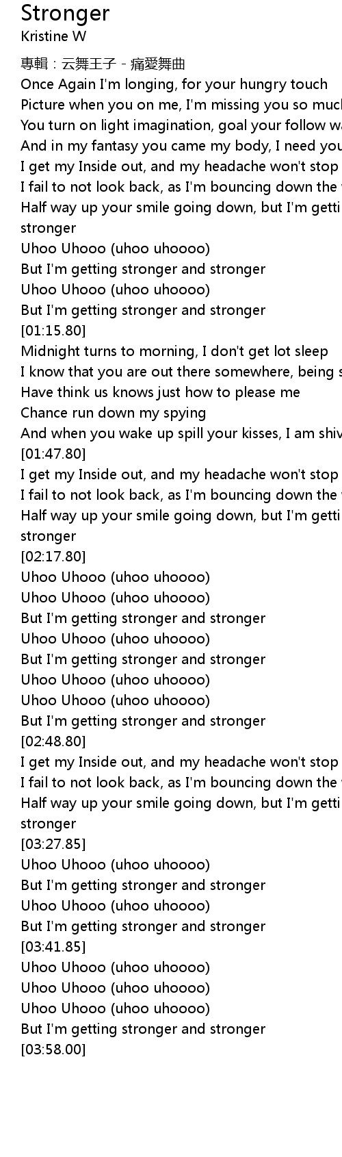 | [02:10.00] | Half way up your smile going down, but I'm getting stronger and stronger |