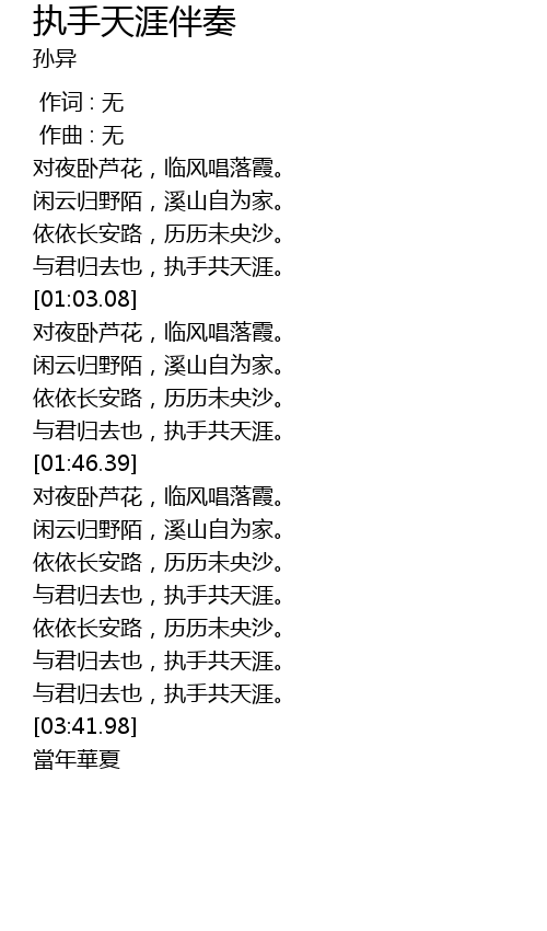 | [03:19.46] | yǔ jūn guī qù yě, zhí shǒu gòng tiān yá. |