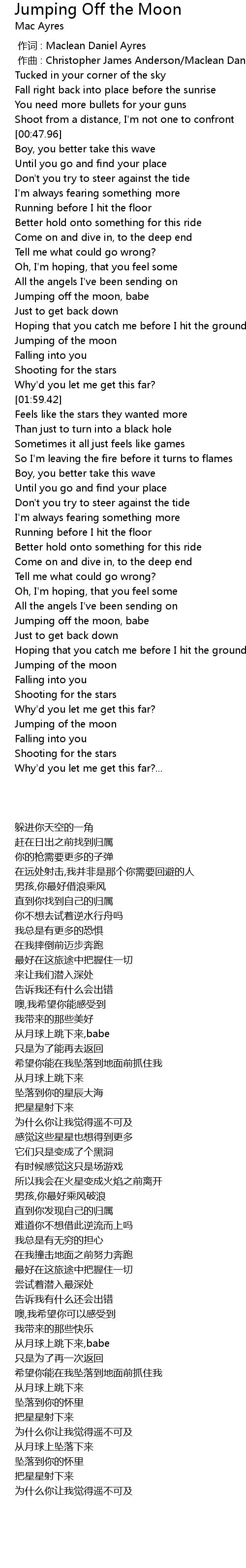 | [03:00.72] | Jumping off the moon, babe |