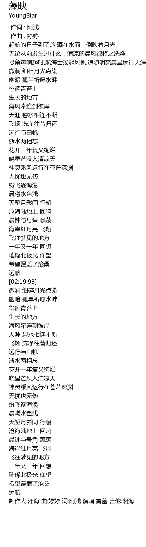 | [04:44.21] | 制作人:湘海 曲:婷婷 词:阿浅 演唱:雷蕾 吉他:湘海 |
