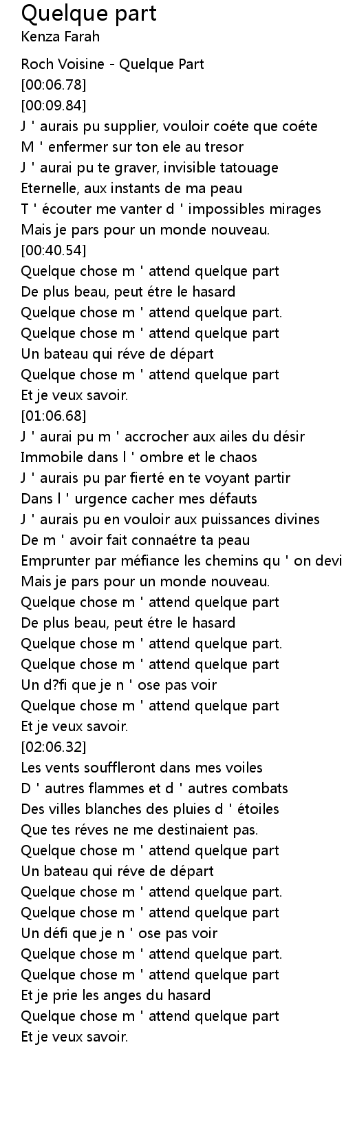 | [01:00.18] | Quelque chose m'attend quelque part |