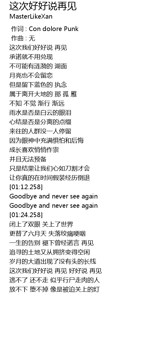 | [01:53.433] | 这次我们好好说 再见 好好说 再见 |