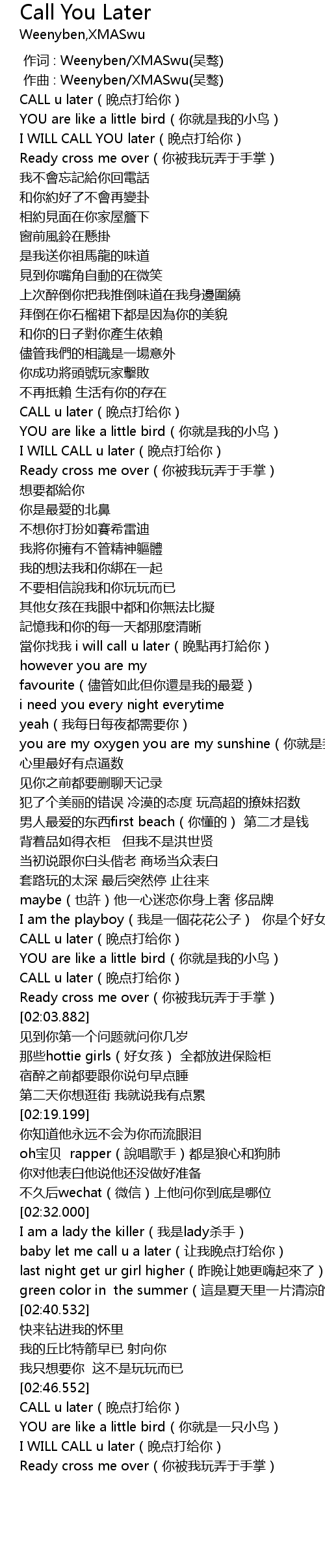| [02:48.312] | CALL u later(晚点打给你) |
