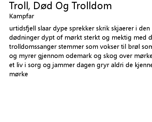 | urtidsfjell slaar dype sprekker skrik skjaerer i den innerste marg sangen fra dødninger dypt of mørkt sterkt og mektig med dunder og brak med kraft og makt trolldomssanger stemmer som vokser til brøl som drønnet fra fossen over moer og myrer gjennom odemark og skog over mørke urtidssjoer troll død og trolldom et liv i sorg og jammer dagen gryr aldri de kjenner ikke til sol de lever i mørke |