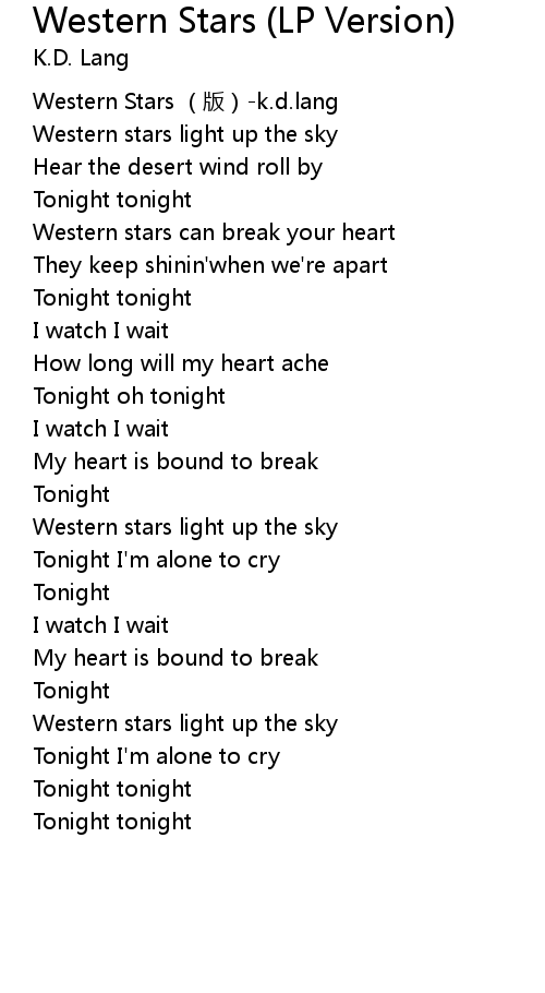 | [00:00.00] | Western Stars bǎn k. d. lang |