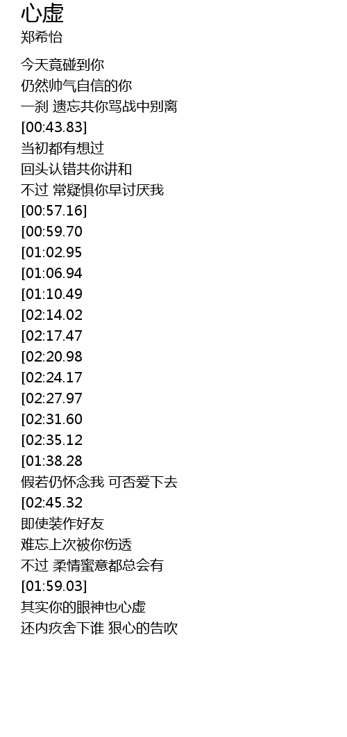| [03:00.25][02:14.02][01:14.17] | 为何讲笑也心虚 |