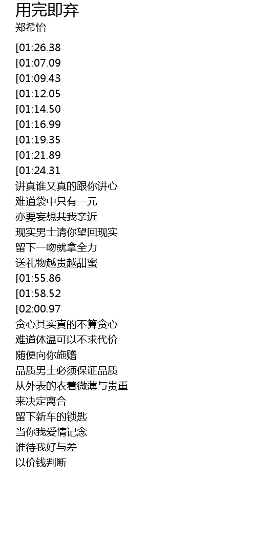| [00:11.00][01:26.38][02:48.53][03:34.53] | 郑希怡-用完即弃(粤) |