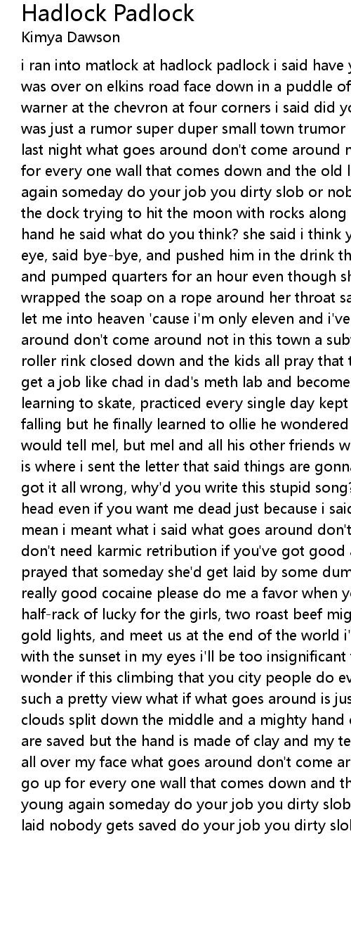 i ran into matlock at hadlock padlock i said have you seen my love? he said he was over on elkins road face down in a puddle of blood then i ran into blair warner at the chevron at four corners i said did you see him die? she said that was just a rumor super duper small town trumor he was shipped off to treatment last night what goes around don't come around not in this town seven walls go up for every one wall that comes down and the old ladies pray they'll be young again someday do your job you dirty slob or nobody gets paid she was standing on the dock trying to hit the moon with rocks along came a man with his cock in his hand he said what do you think? she said i think you stink then she spit in his eye, said bye-bye, and pushed him in the drink then she went to the pay shower and pumped quarters for an hour even though she made it she still felt violated wrapped the soap on a rope around her throat said dear god i really hope you'll let me into heaven 'cause i'm only eleven and i've got nowhere to go what goes around don't come around not in this town a subway sandwich shop goes up and the roller rink closed down and the kids all pray that they'll either get away or get a job like chad in dad's meth lab and become rich one day little david was learning to skate, practiced every single day kept falling and falling and falling but he finally learned to ollie he wondered who he'd tell, thought he would tell mel, but mel and all his other friends were in the county jail which is where i sent the letter that said things are gonna get better he said you've got it all wrong, why'd you write this stupid song? i said 'cause you're in my head even if you want me dead just because i said exactly what i meant doesn't mean i meant what i said what goes around don't come around not in this town you don't need karmic retribution if you've got good ammunition and mama always prayed that someday she'd get laid by some dumb **** with a pickup truck and really good cocaine please do me a favor when you go to penny saver get a half-rack of lucky for the girls, two roast beef mighty bites, a pack of old gold lights, and meet us at the end of the world i'll be standing on the cliff with the sunset in my eyes i'll be too insignificant to feel the need to lie i wonder if this climbing that you city people do ever leads you to a place with such a pretty view what if what goes around is just a naked crying clown and the clouds split down the middle and a mighty hand comes down and we think that we are saved but the hand is made of clay and my tears make messy make up streaks all over my face what goes around don't come around not in this town seven walls go up for every one wall that comes down and the old ladies pray they'll be young again someday do your job you dirty slob or nobody gets paid nobody gets laid nobody gets saved do your job you dirty slob or nobody gets paid