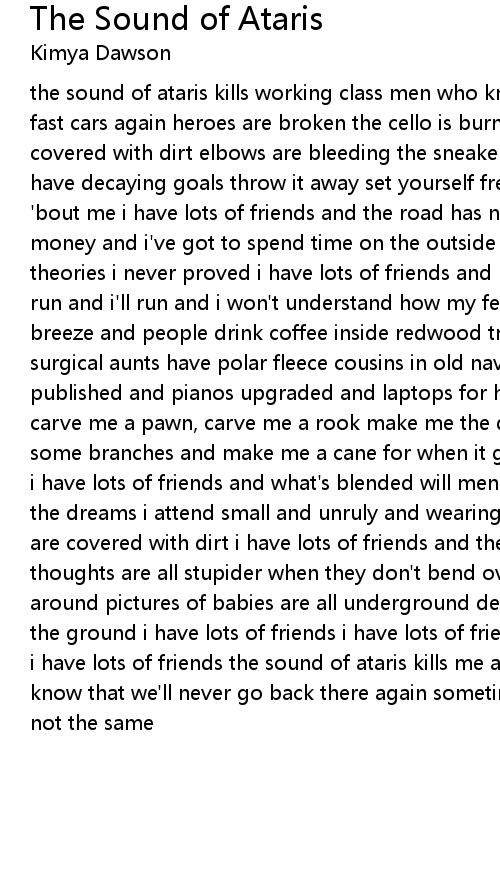 the sound of ataris kills working class men who know that they'll never drive fast cars again heroes are broken the cello is burnt pictures of babies are covered with dirt elbows are bleeding the sneakers have holes decaying rooftops have decaying goals throw it away set yourself free run to the ocean don't worry 'bout me i have lots of friends and the road has no end and your time is your money and i've got to spend time on the outside of being removed from forgotten theories i never proved i have lots of friends and my life is pretend and i'll run and i'll run and i won't understand how my feet stick out the cold desert breeze and people drink coffee inside redwood trees renaissance uncles and surgical aunts have polar fleece cousins in old navy pants with heroes all published and pianos upgraded and laptops for hearts that are sharp and serrated carve me a pawn, carve me a rook make me the queen of my own storybook gather some branches and make me a cane for when it gets hard to support my own weight i have lots of friends and what's blended will mend i'm bo peep and my sheep are the dreams i attend small and unruly and wearing your shirt pictures of babies are covered with dirt i have lots of friends and the road is my friend and my thoughts are all stupider when they don't bend over and wrap underneath and around pictures of babies are all underground dead and they're buried down in the ground i have lots of friends i have lots of friends i have lots of friends i have lots of friends the sound of ataris kills me and my friends 'cause we know that we'll never go back there again sometimes we play playstation but it's not the same |