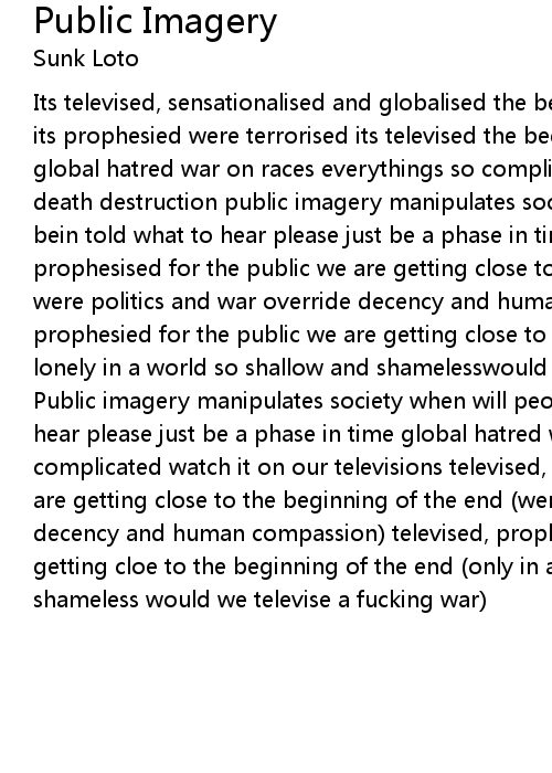 Its televised, sensationalised and globalised the beginning of the end is near its prophesied were terrorised its televised the beginning of the end is near global hatred war on races everythings so complicated see it in our televisions death destruction public imagery manipulates society when will people see were bein told what to hear please just be a phase in time please just televised, prophesised for the public we are getting close to the beginning of the end ( were politics and war override decency and human compassion) televised prophesied for the public we are getting close to the beginning of the end lonely in a world so shallow and shamelesswould we televise a fucking war!!! |
