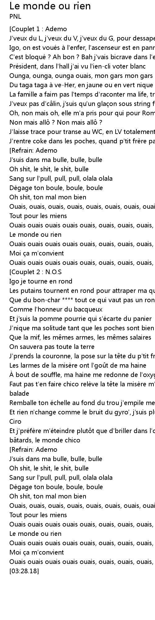 | [03:19.45] | Ouais ouais ouais ouais ouais, ouais, ouais, ouais, ouais |