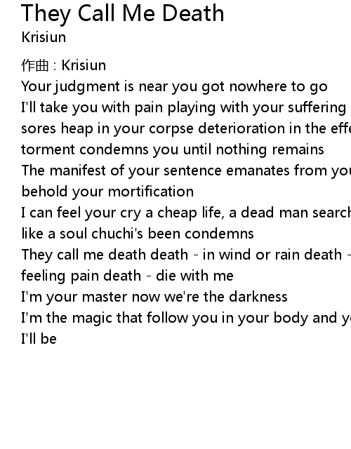 | They call me death death in wind or rain death at night and day death feeling pain death die with me | |