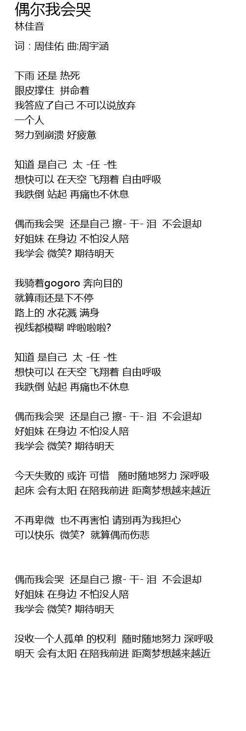 | ǒu ér wǒ huì kū hái shì zì jǐ cā gàn lèi bú huì tuì què | |