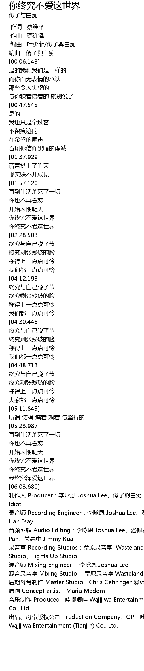 | [06:04.341] | zhi zuo ren Producer: li yong en Joshua Lee sha zi yu bai chi Fool and Idiot |