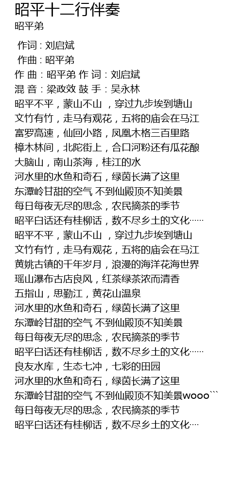 | [00:16.694] | 昭平不平,蒙山不山 ,穿过九步埃到塘山 |