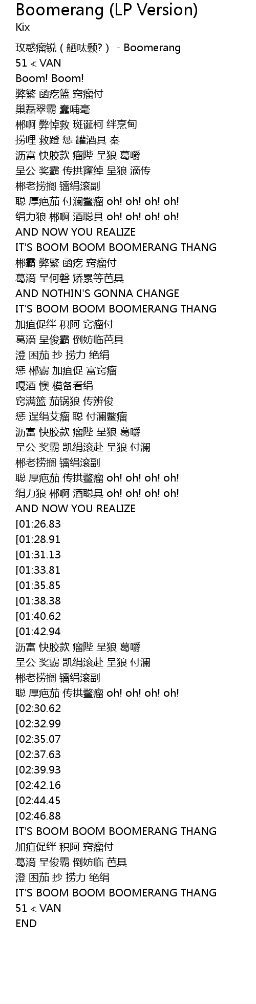 | [02:49.43][02:30.62] | IT' S BOOM BOOM BOOMERANG THANG |