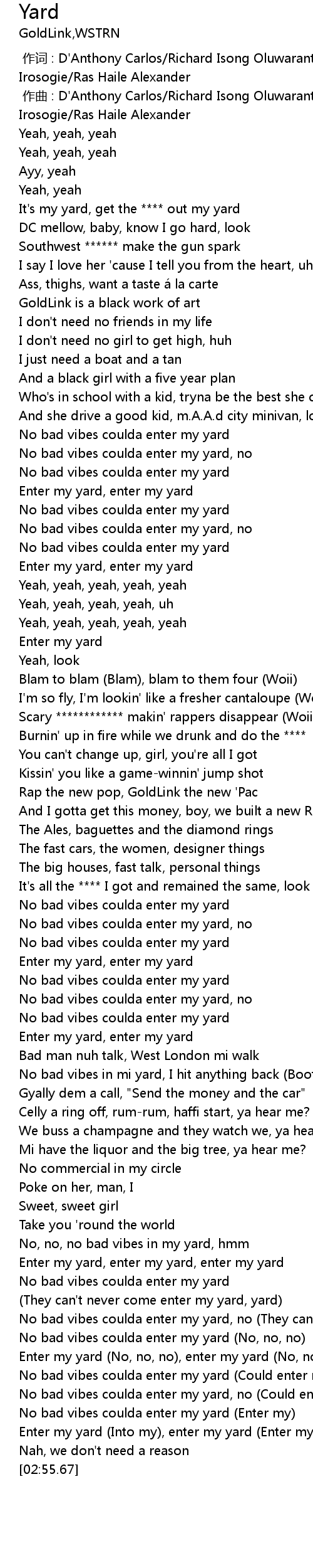 | [02:39.73] | No bad vibes coulda enter my yard Could enter my yard |