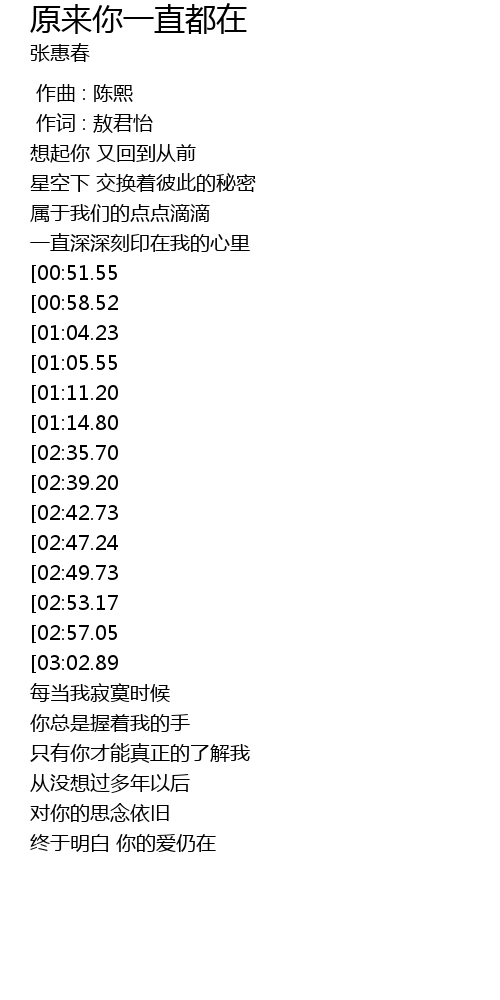 | [03:39.04][02:35.70][01:22.84] | 你原来一直都在 |