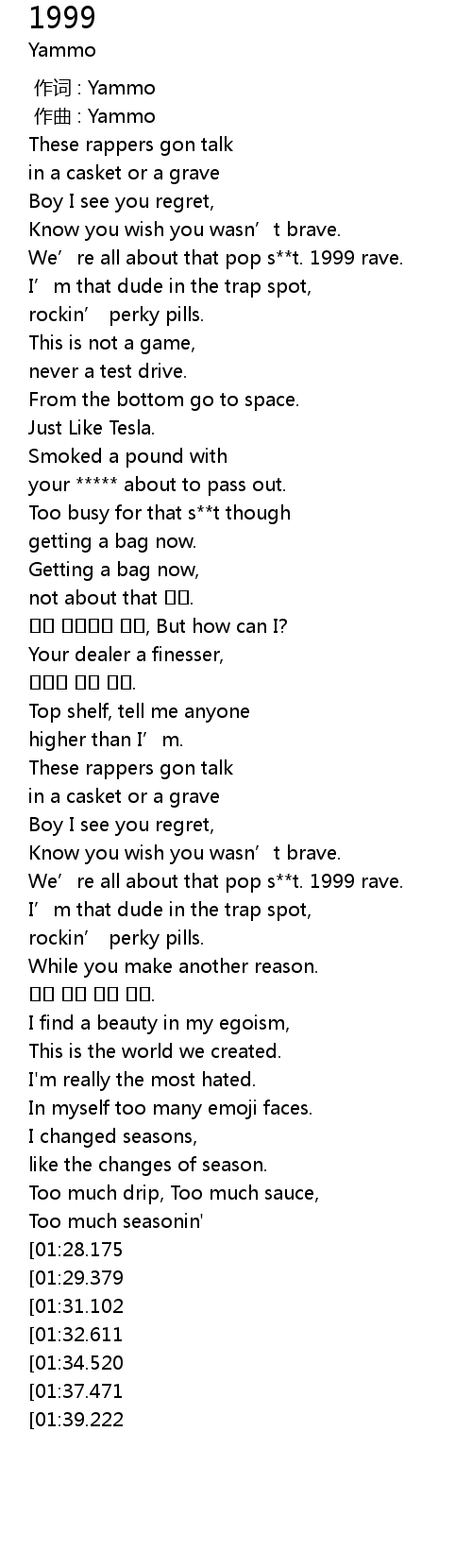 | [01:47.170][01:34.520] | We’re all about that pop s**t. 1999 rave. |
