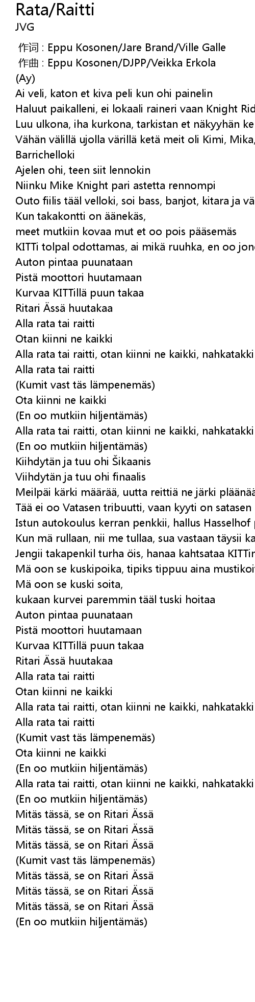 | [01:29.90] | Tää ei oo Vatasen tribuutti, vaan kyyti on satasen minuutti |