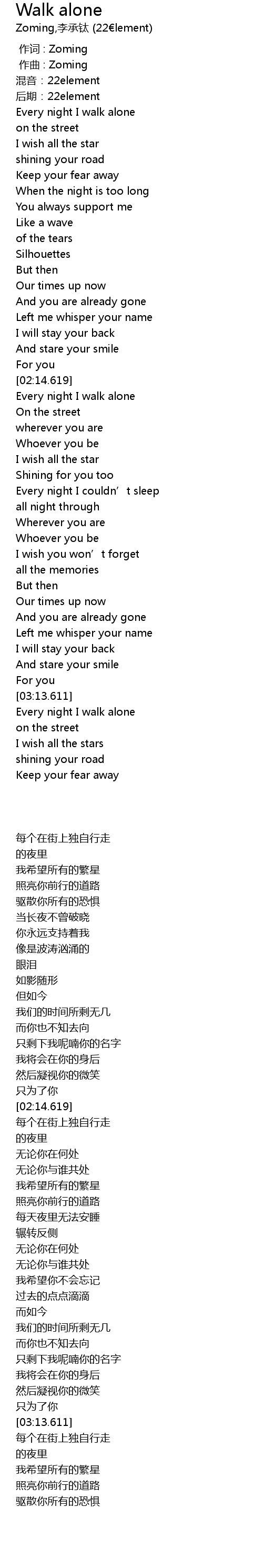 | [02:17.613] | Every night I walk alone |