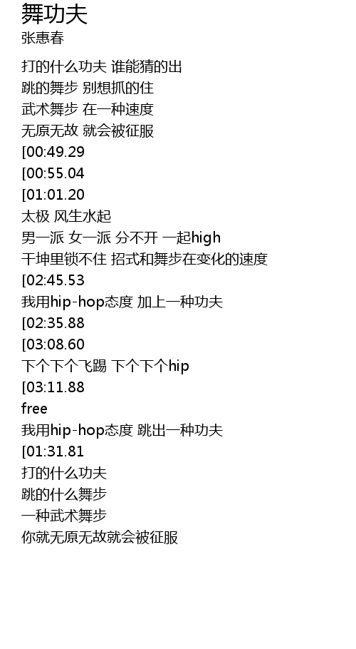 | [02:51.32][02:45.53][02:33.71][01:18.44] | hiphop tai du jia shang yi zhong gong fu |
