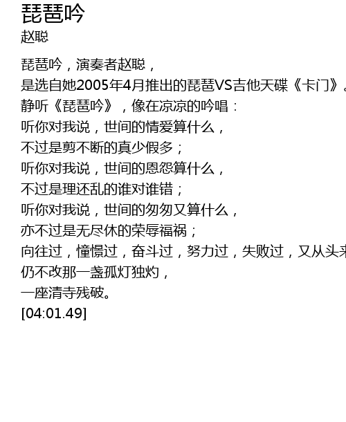 | [00:04.15] | 琵琶吟,演奏者赵聪, |
