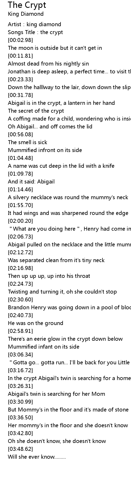 | [03:20.56] | In the crypt Abigail's twin is searching for a home |